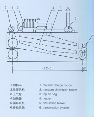 DWP型喷射气流带式干燥类型,热风从狭缝或孔束流向下或向上同时喷向输送带上的物料,由于喷射气速高达15m/s以上,故对流传热的膜极薄,传热系数大,干燥速度快。